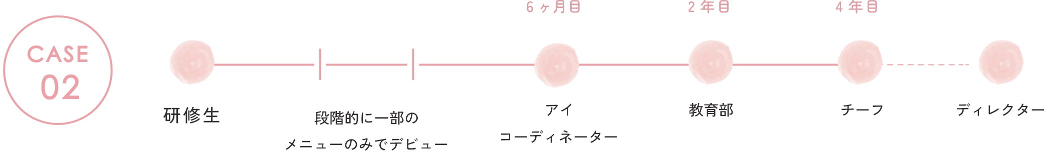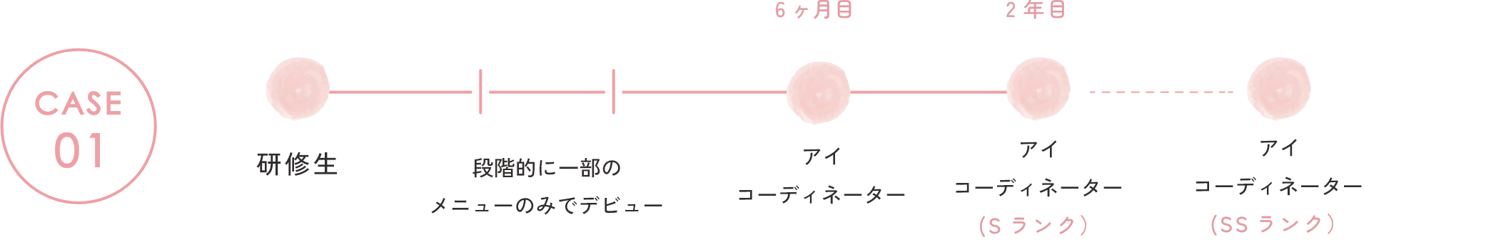 。あなたの未来をカタチにするステップがあります。bettyでは、一人ひとりの個性やペースに合わせた教育カリキュラムを用意しています。基礎からしっかり学べる環境と、成長を支える先輩のサポートがあるから、初めてでも安心。「いつか、こうなりたい」を一緒に実現していくための道のりが、ここにあります。明確なキャリアステップと柔軟な働き方で、あなたの“なりたい”を応援します。